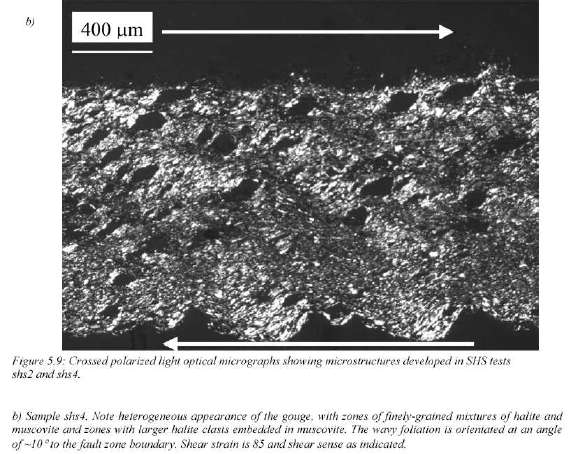 Niemeijer subjected his mixture of mica and salt in a brine to shearing and observed the results. At low velocities, pressure solution was the limiting factor. Movement was accommodated by sliding and ductile flow of the phyllosilicate grains and limited by pressure solution. A strong foliation developed. At higher velocities, porosity developed and the flow became granular as in a gauge--or to add my interpretation, a pseudoconglomerate. Interestingly the rock was weaker--that is there was less resistance to the shearing force--at lower velocities than at slightly higher velocities. When granular flow and porosity developed, the rock again weakened.