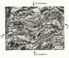 Much of the discussion of F3 folds is linked to the above discussion of F2 folds. As noted above, there are some serious problems distinguishing between the two. In all likelihood, an F3 fold is one that has been folded or appears to fold the S2 foliation. Again, progressive deformation is a much simpler explanation. |