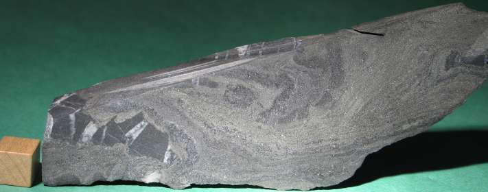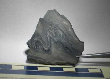 | Here is a photo showing a sulfide band with apparent flame structures at the top (a soft sediment structure) and a row of dominos in line with the pencil. It appears that flow in the more fluid center part caused the dominos and folding in the lower layer. | ![]() |