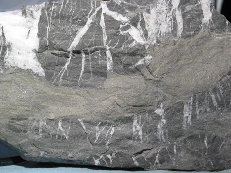 Again, Freitag (2000) differs somewhat in her interpretation of the structure. She lists an additional deformation of early low angle thrusting between D1 and D2. She does not address D4. But perhaps most importantly, she attributes the very extensive ladder veining that is so important in the Mine Argillite unit--and as a guide to ore--as being diagenetic. A photo is shown below the questions section. The mine's model attributes ladder veining to a Cretaceous D2 event, I believe. I am looking for public copies of diagrams of the structural interpretation of the geology. They are shown in public on a regular basis, but I don't have copies right now. So as we close the "standard model" on structure structure and lithology, we have lithologies that indicate rather radical tectonic activity at the time the rocks were deposited--yet we have a structural model that does not reflect a bit of this. Can this be right? |