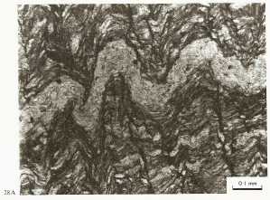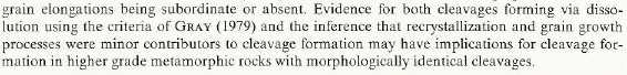 When I was looking at Greens Creek thin sections with Rainer Newberry, he loaned me the "Atlas of Deformational and Metamorphic Rock Fabrics" and suggested I consider the "metamorphic" explanation for the structure. (I had considered this some time before--after all, that's what I was taught when I worked there.) But I took the book and looked for textures that resembled those at Greens Creek. I found quite a few that were strikingly similar. I looked deeper. Some of the Greens Creek-like textures were from rocks that were not recrystallized--i.e., not metamorphosed at all in the sense that was being advocated. The references pointed to pressure solution as the cause of the foliations, spaced cleavages, and crenulations. I learned that pressure solution doesn't require recrystallization or even induration. In fact, because it needs fluids and fluid pathways, it may well do better in rocks that are less mature.