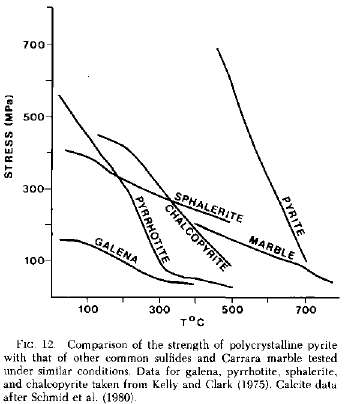 most brittle and strongest minerals. To the right is a graph from Cox, S.F., Ethridge, M.A., and Hobbs, B.E., 1981. The experimental ductile deformation of polycrystalline and single crystal pyrite. Econ. Geol., 76:2105-2117. It shows the very high temperatures and pressures required to deform sulfide minerals. An interesting thing to note is the inclusion of marble on the graph. Much of the surrounding rock, including the massive argillite, is in fact a carbonate rock. Above I have shown a piece of aragonitic textured carbonate. Clearly these have not been converted to marble. |