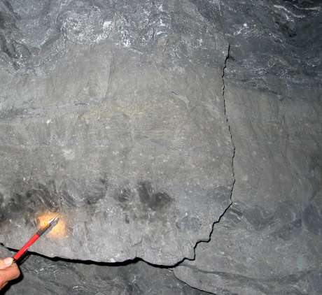| Here is another larger scale example from the 5250 Orebody. Again the sulfide seems to be eating away at the argillite--and it looks as if it is flowing. | ![]() |