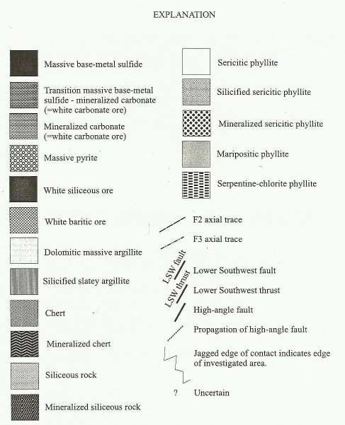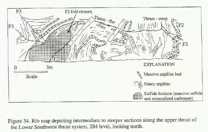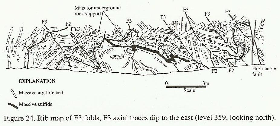 As I attempt to elucidate below, if one recognizes that the deformation--meaning foliation, folding, and early faulting occurred at about the same time as the rocks were formed, the structure of the deposit is understandable as a simple but intense seafloor collapse. There are other factors in play, but the great bulk of the apparent complication is attributable to one event. The complex structure is suddenly simple.