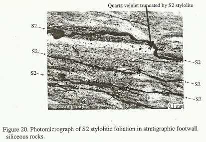 ![]() Above: Primary sulfide depositional textures, Upper Southwest Orebody. Right: Photomicrograph of ladder vein and stylolite. Note author's interpretation that these veins are diagenetic. That is at odds with other workers. From Freitag, 2000. |