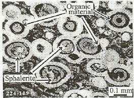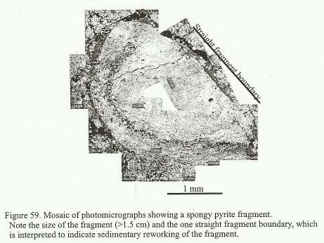 | Here is an example of folded sulfide that I collected and a photomicrograph made from this piece. The rounded spongy looking minerals in the photomicrograph are framboids. And framboids are primary depositional features. (This rock is of interest because the folding resembles what one would expect from soft sediment deformation. If the rock was recrystallized--which it is not--then soft sediment deformation would be a less likely explanation.) | ![]() ![]() |