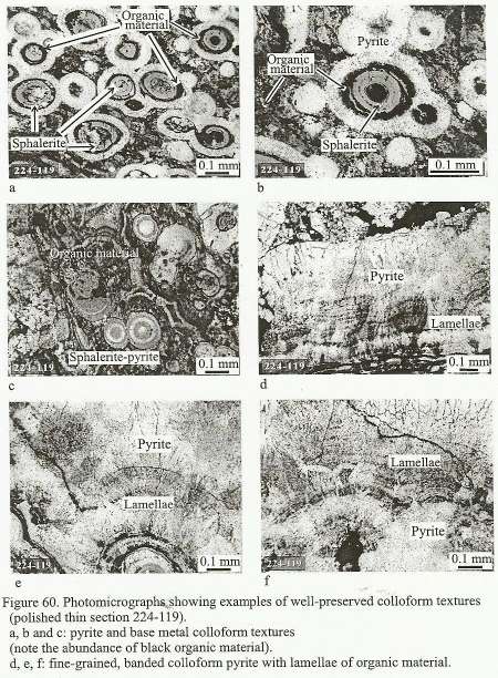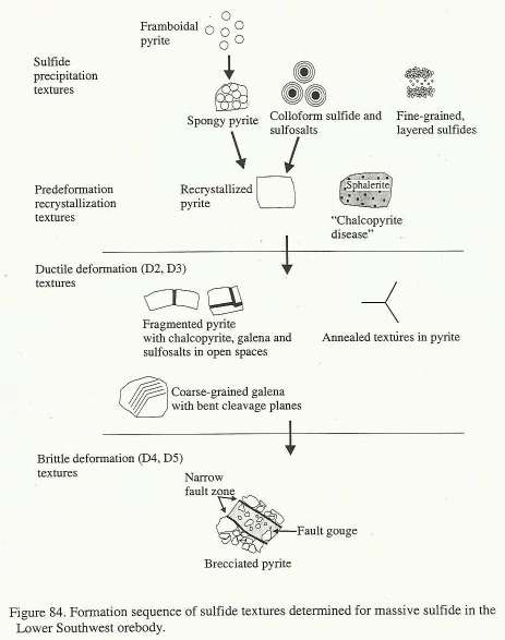 other work or working assumptions used by mine staff. First and significantly, Freitag found that the majority of textures in the Lower Southwest Orebody were primary depositional textures. That is they were textures resulting from seafloor sulfide deposition. Freitag's figure to the left shows some of these features. |