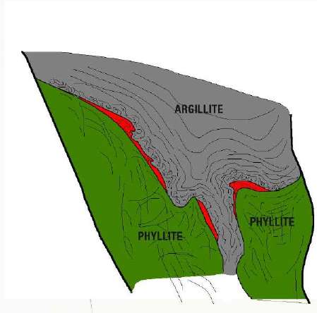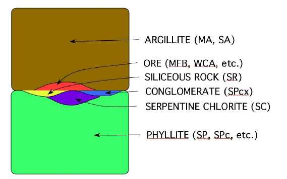 complexity--and the continuity--of the ore. These models are the best I have but they do not reflect some of the morphology that is apparent when manipulating the mine's more powerful program. Apparently, there is a central keel that is almost flat lying just above the SW Ore and the 200S Ore. To the right is a cartoon (to be revised) that shows the post collapse relationship of the units. To restore the cartoon to the current situation, one would rotate it 90 degrees in a clockwise direction. The central keel is the tongue of argillite in the center. What is not shown on the cartoon are the melange ores--the Upper Southwest Ore and the 5250 Ore. These were highly disturbed during lithification. Their location is in the center of the keel and they are separated from the argillite-phyllite contact in places. |