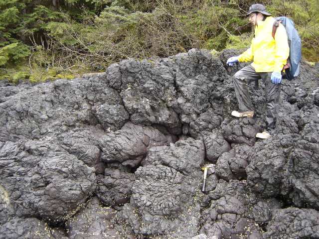 ![]() Above is Triassic Hyd Group pillow basalt from the Gambier Bay area of Admiralty Island. Pillows are also found in the immediate area of the mine as are other primary depositional features that have somehow managed to escape metamorphic obliteration. But then again, metamorphic obliteration may not have happened. (Source: BLM) (It has been suggested to me that this locale is so far away from Greens Creek that it is irrelevant. The fact remains that regionally the Hyd is not a highly metamorphosed unit.) |