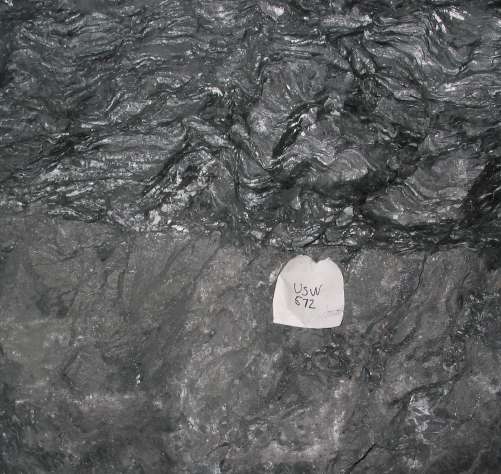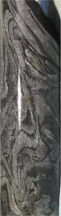 | Typically at Greens Creek, massive sulfides are strong and competent in core or large faces while surrounding rock may be folded and broken. The photo at the right from the Upper Southwest Orebody shows some of this. The deformation in the argillite barely penetrates the massive sulfide. An explanation for this could be that progressive lithification of the sulfide caused it to no longer react as a mud. The D3 deformation evident at the top of the photo is a result of pressure solution. Since the sulfides are not amenable to pressure solution deformation, they have escaped the intense deformation of the surrounding rocks. | ![]() |