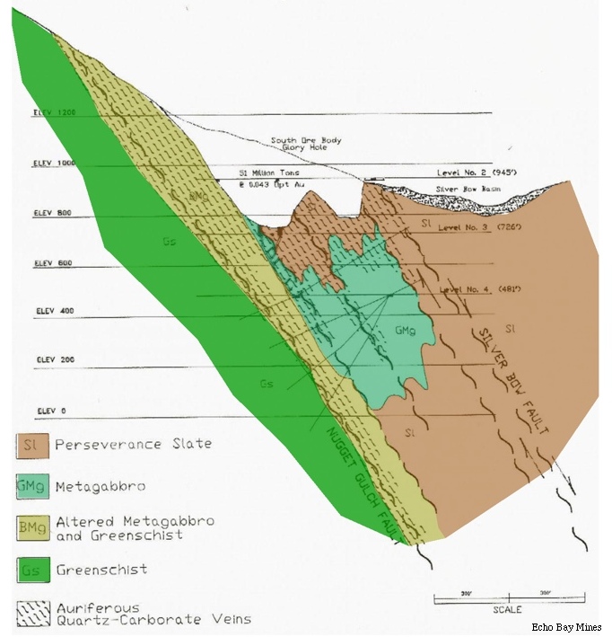 The Conventional Explanation: The early-folded veins, the ore-centered-gabbros, and the metamorphic mineral assemblage as well as other structures all predate the ore-forming event. The surmise is that remote regional metamorphism associated with a 55Ma intrusive drove fluids to the syncline and mafic rocks where they ponded. (Redman et al., 1989) This speculation is based in significant part on Ar/Ar dates from hydrothermal sericite. The vein sets are attributed to simultaneous transpression despite indications that major transform movement did not begin until much later. The Progressive Penecontemporaneous Deformation Explanation: The syncline that forms the center of the ore zone and the locus of the mafic igneous rocks is actually a penecontemporaneous collapse feature. The vein sets are the result of progressive deformation during the collapse. The mafic igneous rocks are likewise associated with the collapse. The tensional regime is the simple result of that collapse as are the phyllitic foliations, melange-like textures and tight soft sediment style folding in the center of the deposit. Likewise the high variation in preservation of original textures is indicative of near surface deformation. Later regional metamorphism overprinted the area changing mineralogy and resetting radiometric dates. |