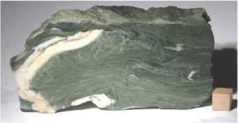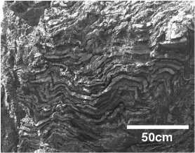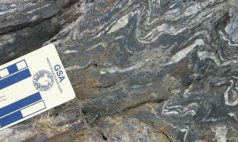 folding--including ptygmatic folding of veins and beds is a mélange feature. Source Byrne 1994, Figure 8.8a. Special thanks to Tim Byrne for providing an high resolution photo. |