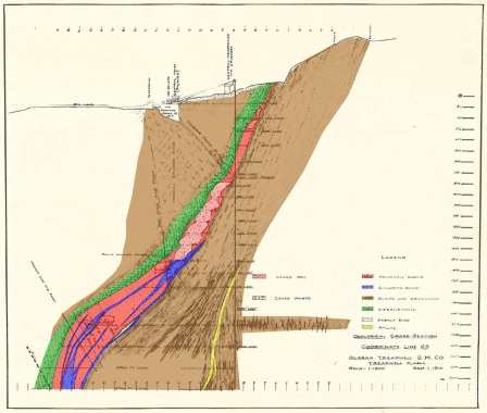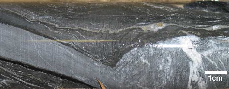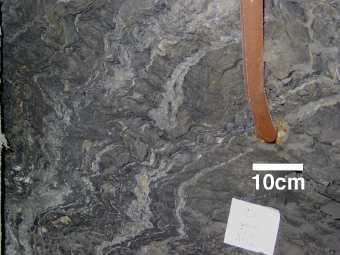 ![]() Folding adjacent to a mafic sill in the ore zone. |