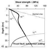 suggested a radical change in the strength envelopes for phyllosilicate-bearing rocks a ductile shortcut from the brittle deformation of Byerlee's law to the ductile flow laws. Source: Bos & Spiers 2002 Figure 8c. |