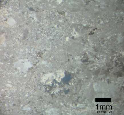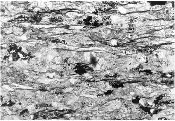 be a starting place for the diagenetic foliation, but note how pressure solution as evidenced by the opaque wisps of insoluble mineralshas enhanced it. |