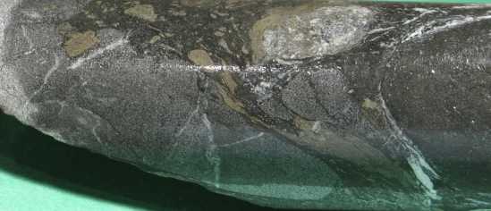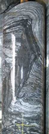 Apparent rounded "cobbles" of calcareous argillite and rounded fine grained pyrite "clasts" and "pebbles"form by pressure solution and movement. Movement and shifting is evident from fractures in the cobbles as in the right center of the photo. Mine Argillite, Greens Creek Mine Alaska. Core is about 10cm diameter. |