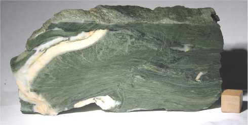 This rock shows a quartz vein that has resisted "deflation" of the surrounding rock by pressure solution. Cube is 1cm. Chlorite sericite phyllite, Greens Creek Mine, Alaska. |