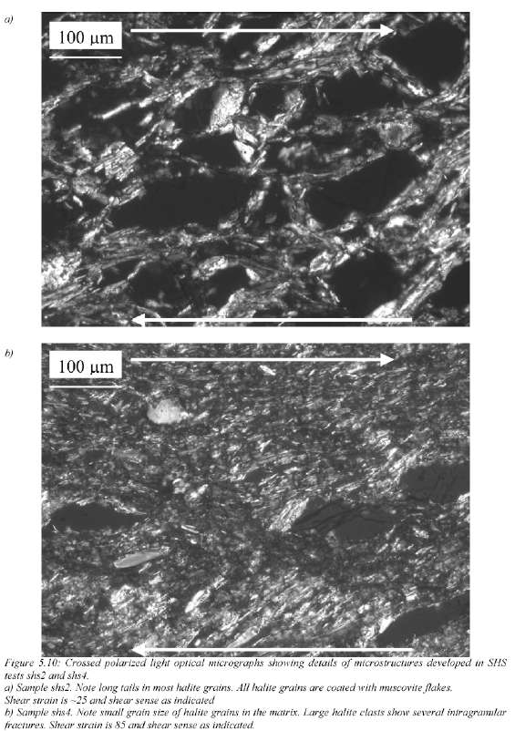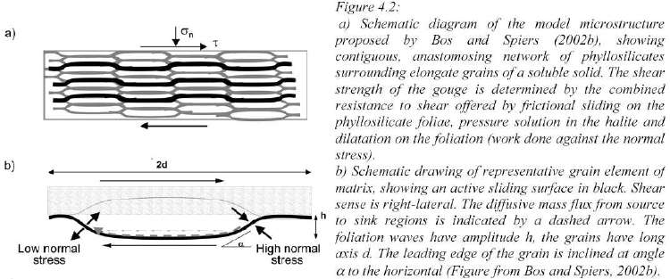 Niemeijer subjected his mixture of mica and salt in a brine to shearing and observed the results. At low velocities, pressure solution was the limiting factor. Movement was accommodated by sliding and ductile flow of the phyllosilicate grains and limited by pressure solution. A strong foliation developed. At higher velocities, porosity developed and the flow became granular as in a gauge--or to add my interpretation, a pseudoconglomerate. Interestingly the rock was weaker--that is there was less resistance to the shearing force--at lower velocities than at slightly higher velocities. When granular flow and porosity developed, the rock again weakened.