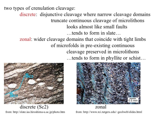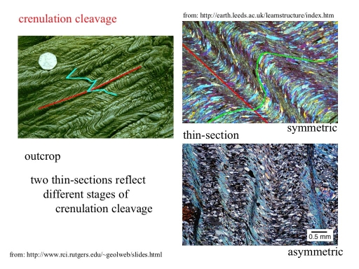 | Good examples relating spaced cleavage to crenulation. It seems likely that the physical processes that caused these two textures must operate under the same physical conditions. Or perhaps it is the same process. | ![]() |