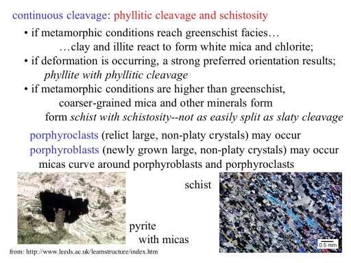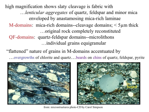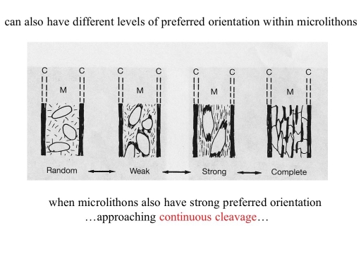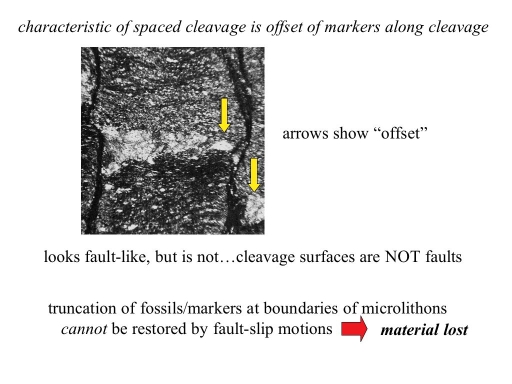 A lingering problem with the explanation of fabrics presented above is its incompleteness. While the mechanism of pressure solution suggests that fabrics need not be metamorphic and can be near-surface or diagenetic, only metamorphic situations are offered to explain the fabrics. For example, the origin of slaty cleavage in essentially unmetamorphosed rocks shown above is described as a result of progressive isoclinal folding. Also, the connection between bedding plane cleavage and high angle spaced cleavage or slatey cleavage is still attributed to two distinct "metamorphic" D1 and D2 events. The constant volume forces may still win the war.