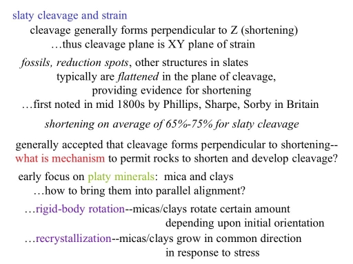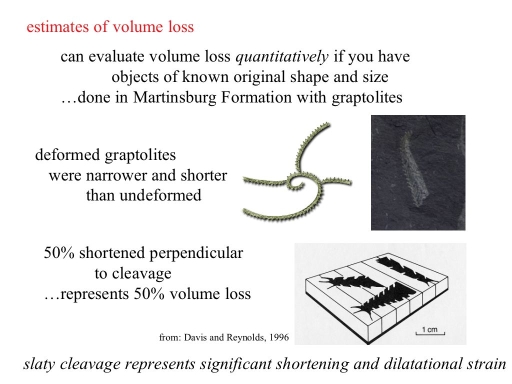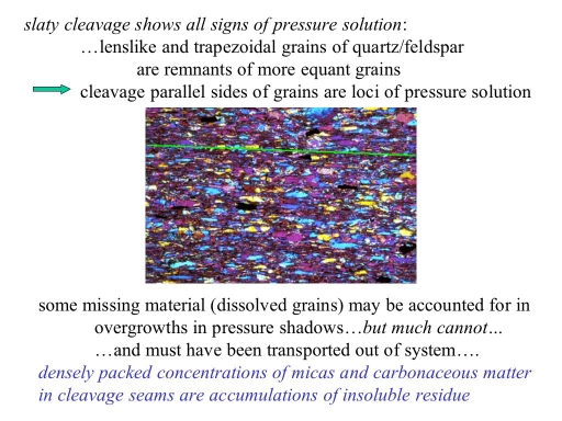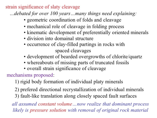 | . . . Constant volume deformation was an underlying but unspoken assumption in the debates [about the origin of cleavage]. . . . It now seems clear that the dominant mechanism for cleavage formation is pressure dissolution [pressure solution] removal of the original host rock. | ||