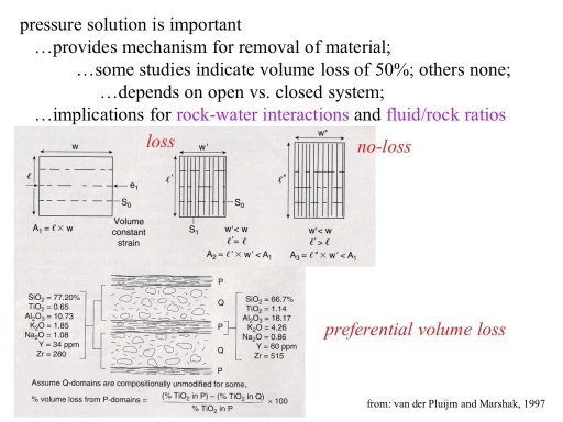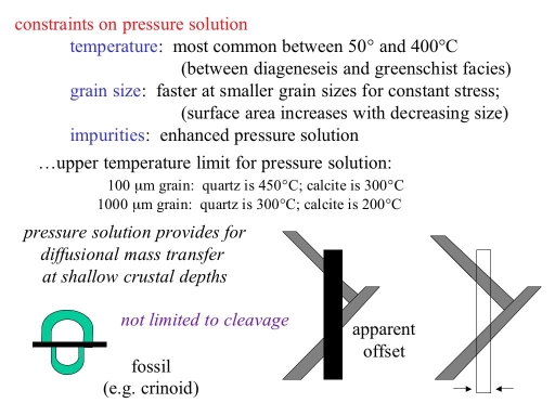 At this point I am hoping readers will appreciate that pressure solution is important in formation of metamorphic-appearing rock fabrics but that it can occur at pressures and temperatures that are not typically thought of as metamorphic. In particular, I am hoping that readers will appreciate that fabrics can be developed in near-surface and diagenetic situations. Certainly, these are conditions where fluids and pathways (porosity and permeability) are available to facilitate pressure solution.