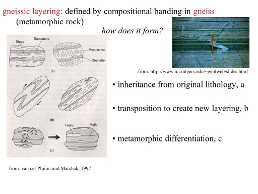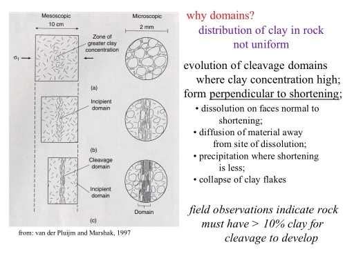 The section above gives one little idea how pressure solution expresses itself in rocks. For that, a more basic course is required. The following graphics are taken from a Power Point lecture by Professor Pamela Jansma of the University of Arkansas for her Structure class. The original can be found here: http://cavern.uark.edu/~pjansma/structure_pdf/geol3514_17_foliations_06.pdf. I thought that this basic discussion of 'fabrics, foliations, and cleavages was particularly good because it recognizes the central role of pressure solution. That said, it also contains some of the central misconceptions of structural and metamorphic geology that I take issue with on this page. It both teaches the basics and give an opportunity to challenge long-accepted assumptions.