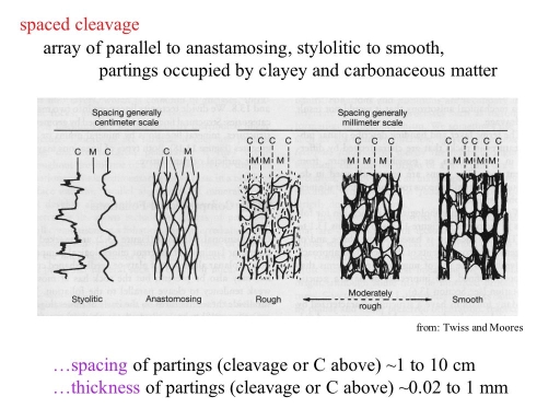 crenulation or stylolite formation. http://igitur-archive.library.uu.nl/dissertations/2006-0315-200011/ As pressure solution progresses, the microlithons of the horizontal foliation would be shortened to the point where the vertical fabric would be dominant. In not-so-extreme cases, verticle structures would be enhanced by this process forming spaced cleavage. Escape of pore fluids on the spaced cleavage would result in greater compaction, thus greater shear stress, and greater normal stress on the spaced cleavage and enhancement of the fabric. |