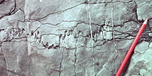 | The photo at the right--and observation of similar features in other rocks, leads me to the idea of folding by pressure solution. One of the knotty geometric problems of folding is a room problem. If one bends rocks, then rock from the core of the fold must move or disappear. Plastic deformation has been advanced as a reason, but many have found it unsatisfactory. Pressure solution is easier. The dissolved rock flows away with the water. Higher stress and enhanced fracturing on the axial plane make pressure solution a likely cause--at least on a small scale . . . perhaps large too. I will develop this more. | ![]() |